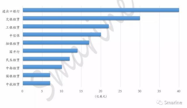 綜合租賃、銀行和中信保的船舶融資數(shù)據(jù),2017年中國船舶融資Top10(以投放額及投保額統(tǒng)計(jì))如下圖: