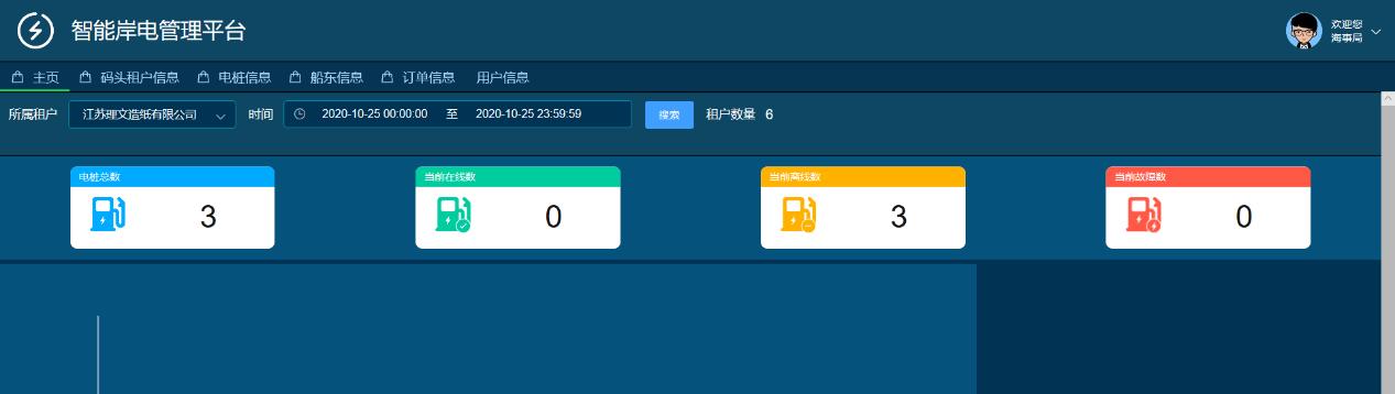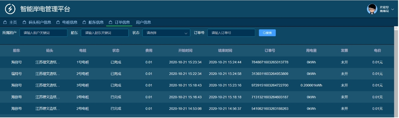 智能岸電管理功能,碼頭租戶通過PC端登錄服務(wù)器對岸電樁進行管理,包括電樁信息、船東信息、訂單信息管理等。海事局通過登錄服務(wù)器可以讀取碼頭租戶、船東、訂單等信息