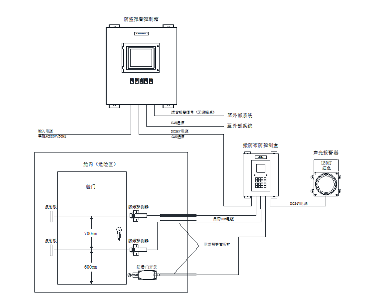 防盜報警控制箱的系統狀態(tài)、報警信息通過CAN通訊發(fā)送至損管通訊模塊,并輸出一路無源常開延伸報警觸點至值班室綜合報警信息裝置;