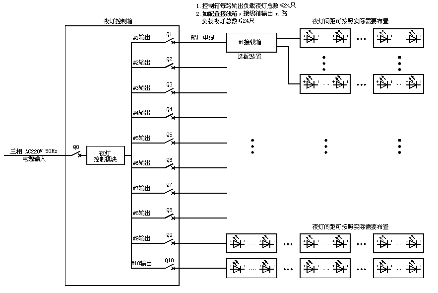 1) 根據系統(tǒng)圖連接各路夜燈,閉合夜燈控制箱內各路供電開關,
