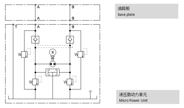 液壓微動力單元采用柱塞泵的結(jié)構(gòu)形式,通過控制電機(jī)的正、反轉(zhuǎn)可實現(xiàn)P、T口的任意切換
